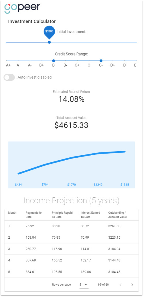 The tool uses the statistics published by goPeer to calculate an estimated rate of return based on the credit score range you choose. Obviously, the higher-risk loans you choose to fund increase your rate of return.